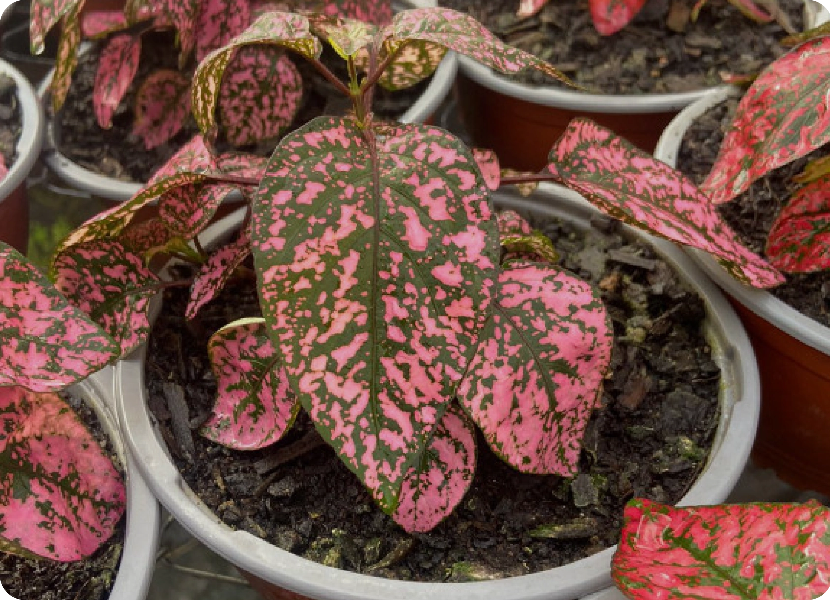 Coleus, oreja de oso, petunias. Renovamos según la estación con variedades únicas.